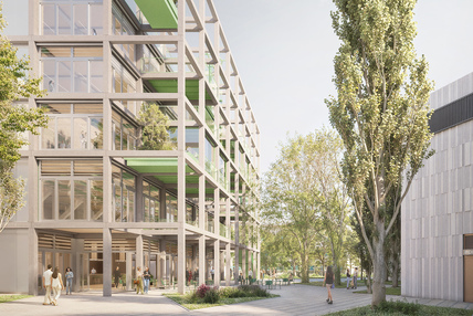 Im Science Park 2 auf dem Eselsberg in Ulm entsteht derzeit ein neues Kunden- und Innovationszentrum für Bosch Rexroth. Neben Büroräumen werden hier später auch Schulungs- und Ausstellungsräume sowie Testlabore und Werkstätten zu finden sein. Der Baukörper setzt sich aus einem einladenden Sockel mit Empfangspavillon und dem Büroturm zusammen. Dieser Büroturm erhält eine prägnante Fassade aus vorgefertigten Holzelementen und setzt somit auf Regionalität und Nachhaltigkeit.