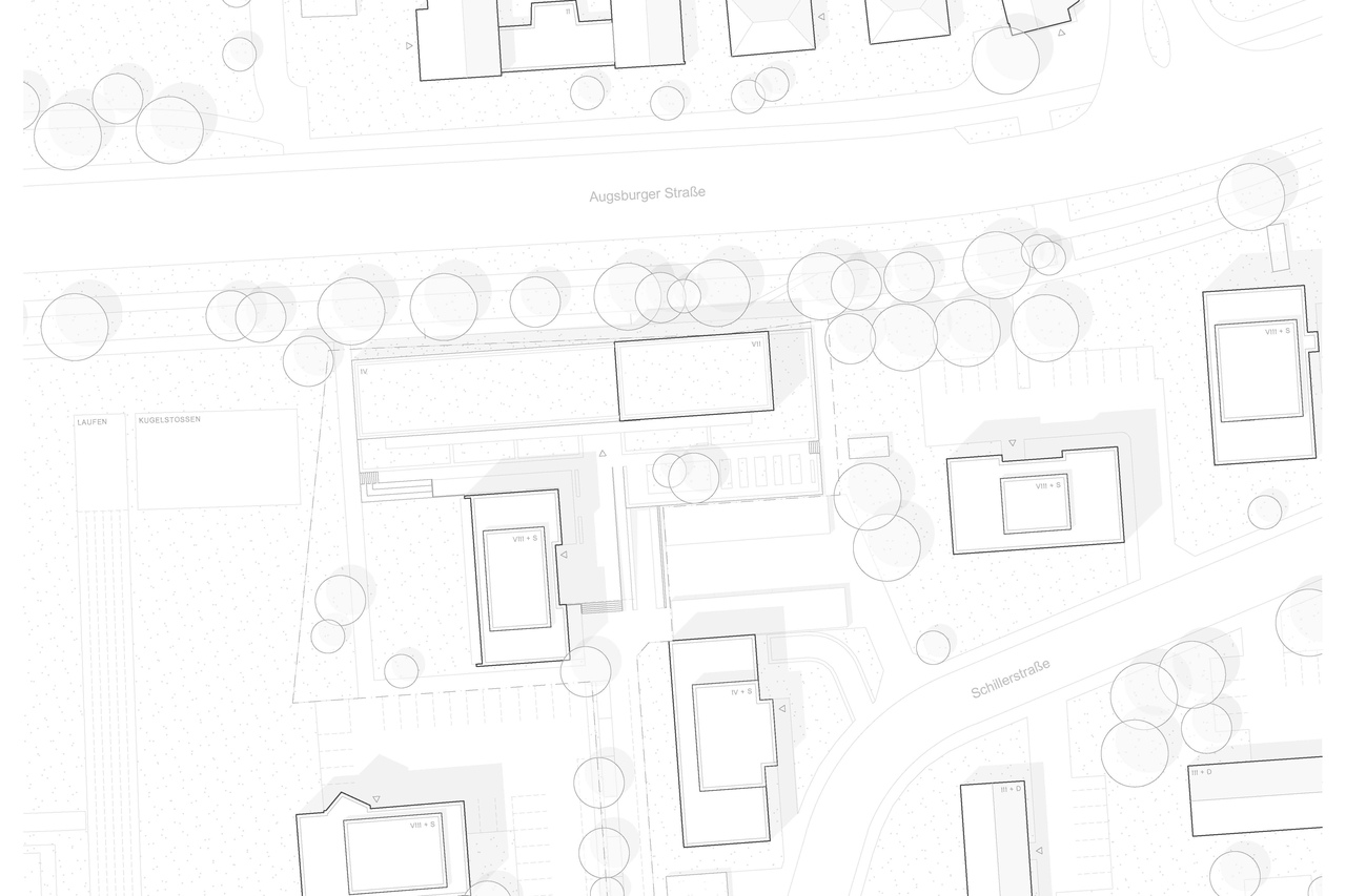In parkähnlicher Lage zwischen Sportanlagen und Freiflächen der Wohnanlage am Ortseingang Offenhausen, ist eine Nachverdichtung des Wohnquartiers an der Schillerstraße geplant. Die alleeartige Ausbildung der Augsburgerstraße mit Ihrem hochwertigen Baumbestand, die achtgeschossige, punktartige Nachbarbebauung aus den 1960er Jahren und der schmale Zuschnitt des Baufeldes prägen die Situation. Geplant ist ein linearer Baukörper entlang der Augsburger Straße, der durch seine Differenzierung in vier bzw. sieben Geschosse einen angemessenen Übergang zur Bestandsbebauung schafft. Der PKW-Verkehr wird künftig unter die Erde verlegt. So können auf der Tiefgarage vielfältige Durchwegungen und Freiräume für die Bewohner entstehen. Der Neubau wird über einen Laubengang auf der Nordseite erschlossen. Vor den Wohnungseingängen können so kleine private Freibereiche entstehen, die Identifikation schaffen und Begegnungen ermöglichen. Der Neubau ist als Hybridbau konzipiert - mit Decken, Stützen und Treppenhäusern aus Stahlbeton, Außenwände in Holzbauweise. Auf der Südseite nimmt ein Stahlskelett die Außenbereiche der Wohnungen auf. Der Holzlamellenfilter vor der Konstruktion erfüllt gleichermaßen Absturzsicherung und Sonnenschutz. Auf der Nordseite übernimmt ein Edelstahl-Seilnetz Absturzsicherung und Rankhilfe für die flächige, siebengeschossige Fassadenbegrünung im Bereich der Laubengänge.