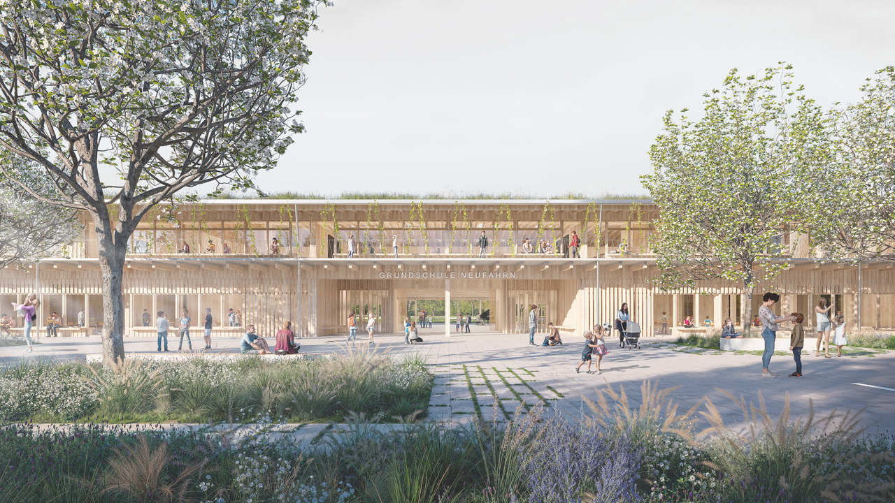 Außenanlagen sind als „Shared Space“ organisiert: Kiss’n-Ride-Zonen, barrierefreie Stellplätze, Fahrradunterstände und verschiedene Spiel- und Ruhebereiche – darunter ein Musikgarten und ein Grünes Klassenzimmer – fördern ein vielfältiges, inklusives Schulumfeld.