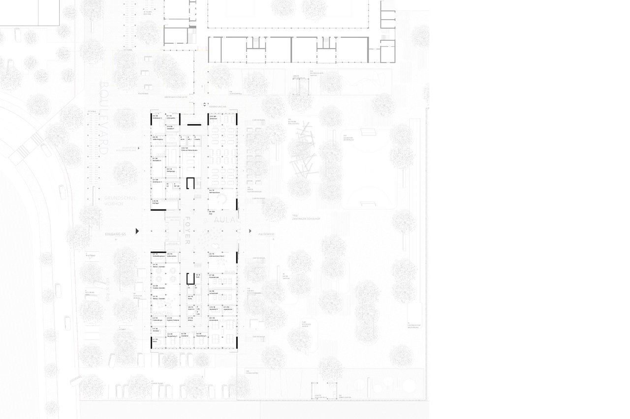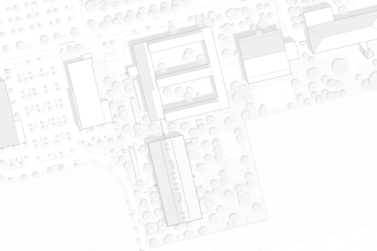 Städtebaulich liegt das Gebäude an der Schulstraße, was eine klare Schülerführung ermöglicht. Es dient als Bindeglied zwischen Grund- und Mittelschule und schafft durch seine Lage zugleich Rückzugsmöglichkeiten vor Lärm und Einblicken.