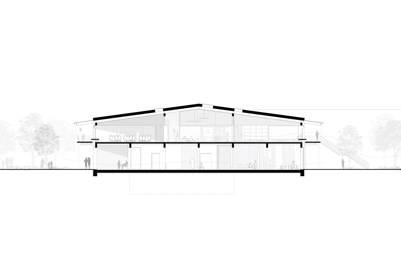 Im Inneren gliedert sich das Gebäude um die zentrale Tenne. Sie dient als wettergeschützter Ort für Begegnung, Veranstaltungen oder Regenpausen. Die Mensa mit Terrasse, ein Mehrzweckraum sowie Ganztagsbereiche sind flexibel nutzbar und funktional sinnvoll platziert.