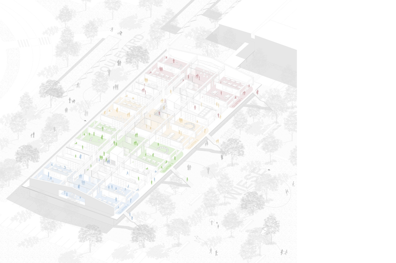 Das Obergeschoss ist ausschließlich dem Unterricht der Grundschule gewidmet. Zwei Lerncluster mit Gruppenräumen und einer umlaufenden Balkonzone ermöglichen ruhiges, naturnahes und flexibles Lernen – unterstützt durch eine architektonisch durchdachte Belichtung.