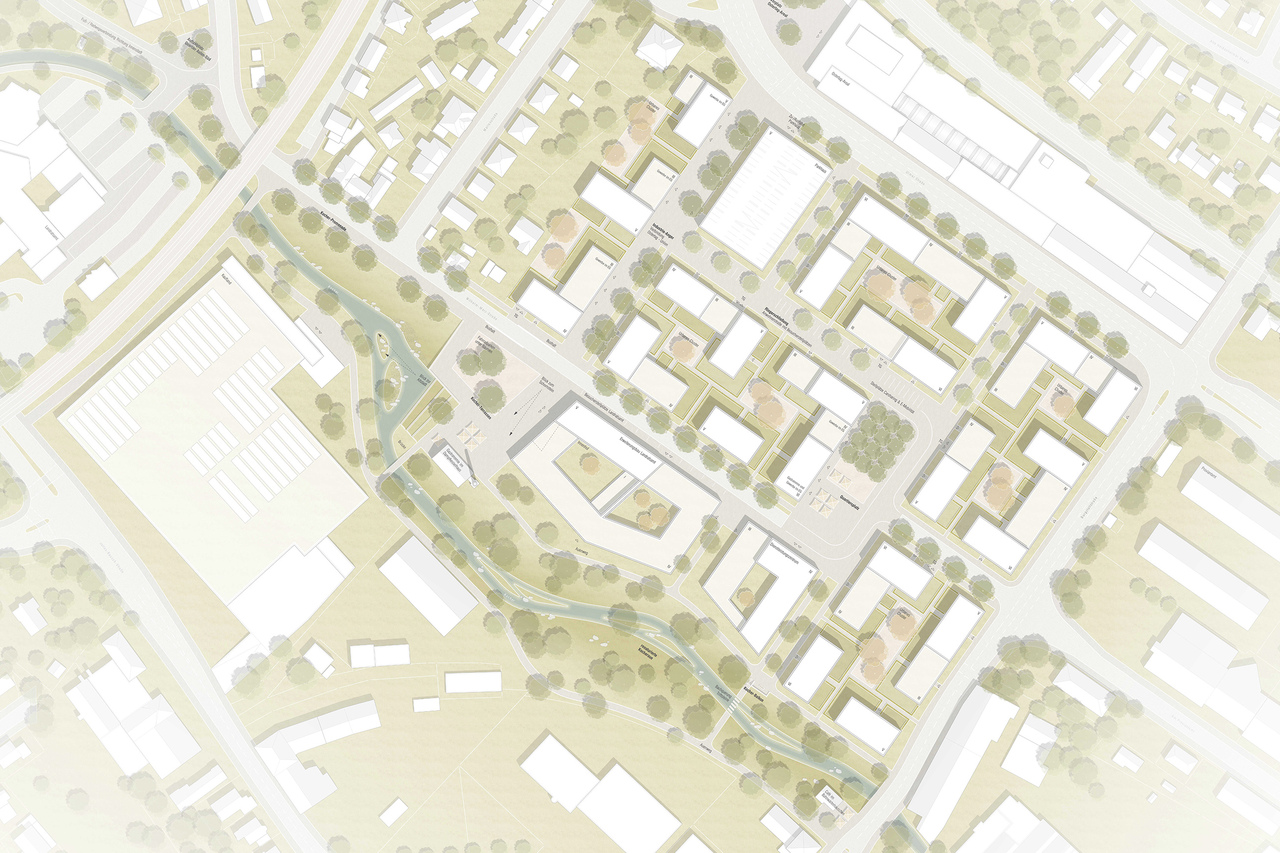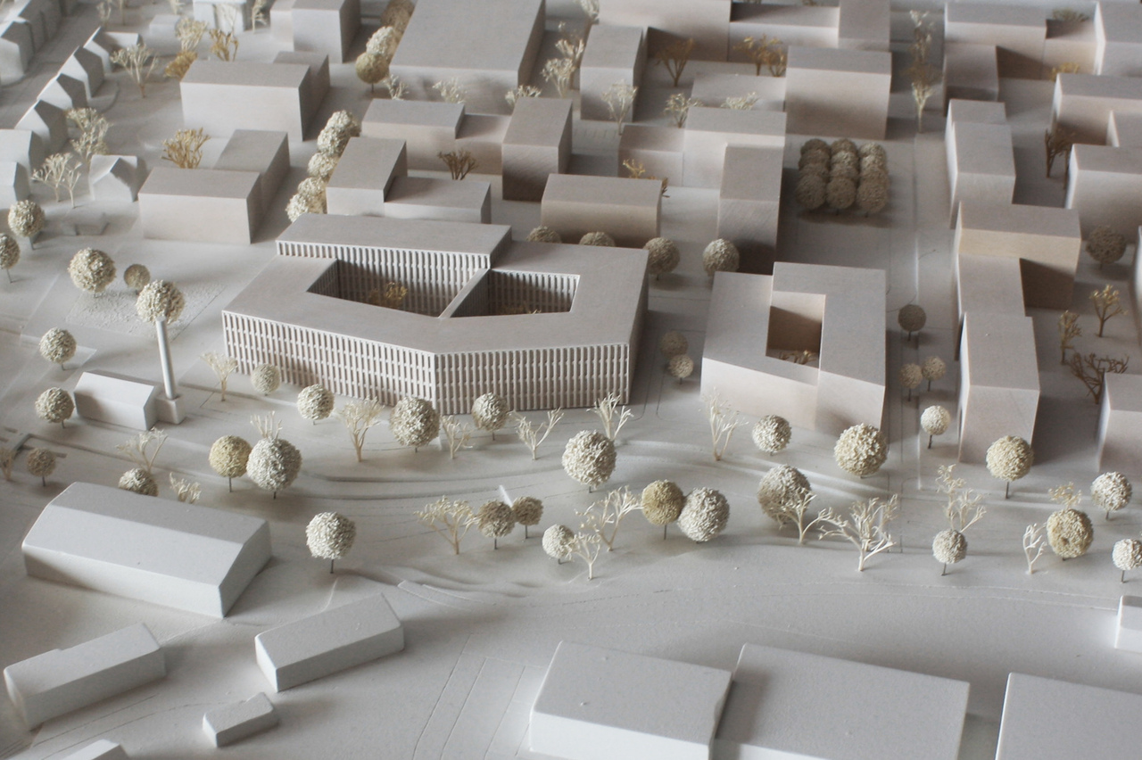 In der neuen aufgezeigten städtebaulichen Entwicklungsidee zwischen aufgelösten Blockrandstrukturen, der renaturierten Kocher-Aue und dem historisch wertvollen Dampfkesselhaus bildet das neue zweite Verwaltungsgebäude des Landratsamtes Ostalbkreis eine wichtig vermittelnde und verbindende Rolle in räumlicher wie funktionaler Hinsicht. Die Raumkanten der westlichen Blockränder aufnehmend, begrenzt es klar den öffentlichen Straßenraum der Wilhelm-Merz-Straße um gleichzeitig nördlich und südlich die Blick- und Bezugsachsen in West-Ostrichtung des neuen Quartieres zu Dampfkesselhaus, den neuen Kocherterrassen und der renaturierten Talaue der Kocher freizuhalten. Die städtebauliche Grundfigur des neuen Gebäudes orientiert sich an dieser vermittelnden Rolle, einerseits leicht polygonal dem Kocherverlauf folgend und andererseits selbstbewusst als Landmarke - das Tor in das neue Quartier und in Richtung Altstadt den Rahmen in die historische Kernstadt Aalens bildend.