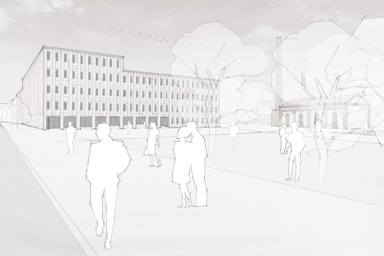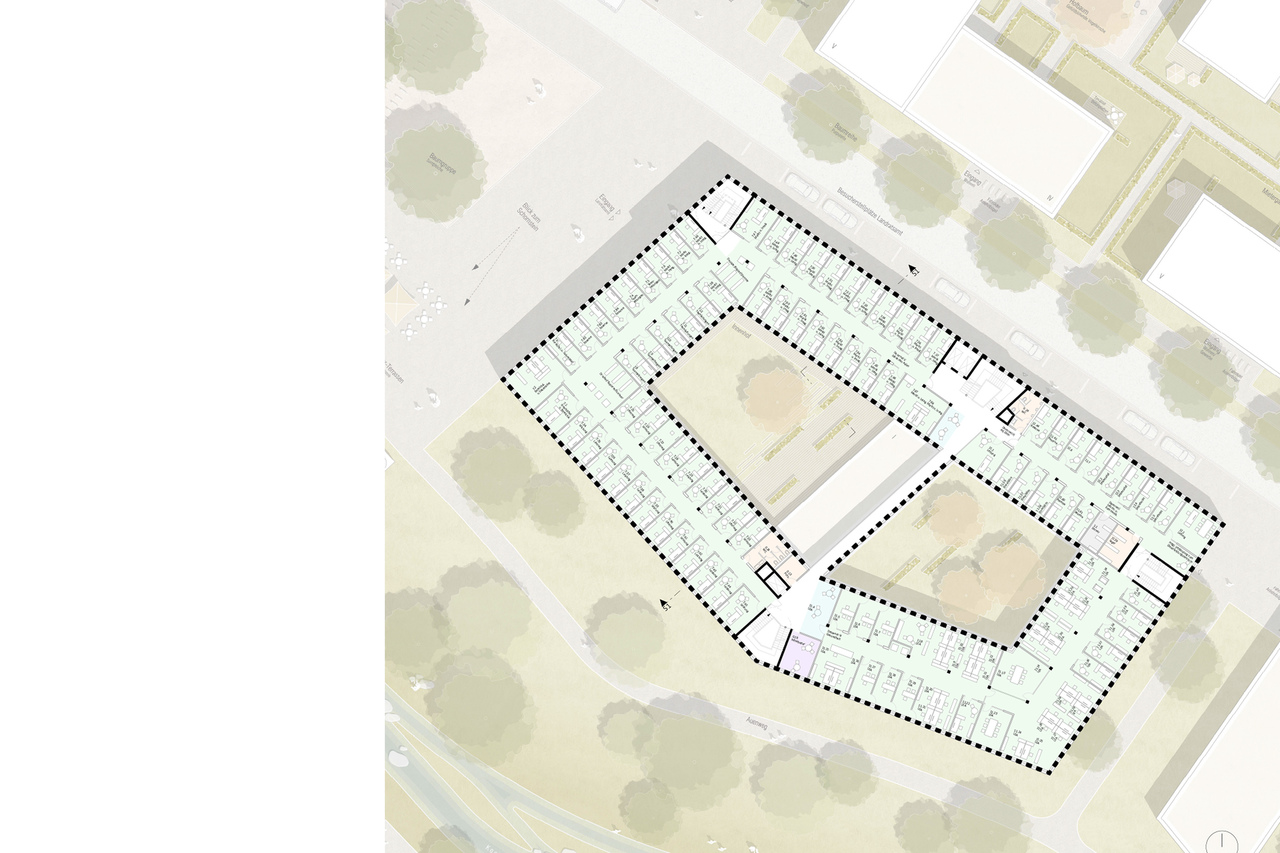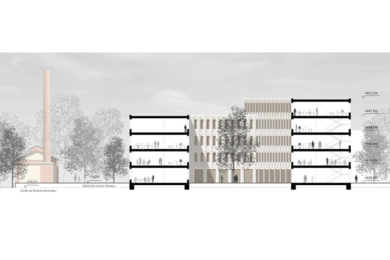 Diese Haltung und Rolle nimmt auch das separat realisierbare Dienstleistungsgebäude auf, welches ebenfalls die aufgelöste Blockrandstruktur mit Blickachsen und Raumzuordnungen aufnimmt und gleichzeitig eine starke Raumkante bildet am neuen Quartiersplatz. Dabei ist eine funktionale Stegverbindung zum Verwaltungsgebäude ohne Störung der außenräumlichen Bezüge möglich.