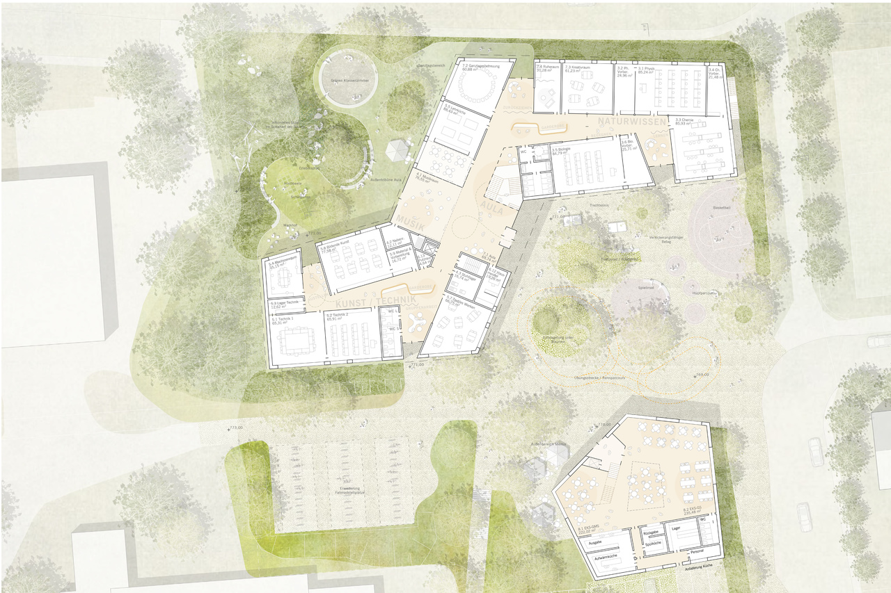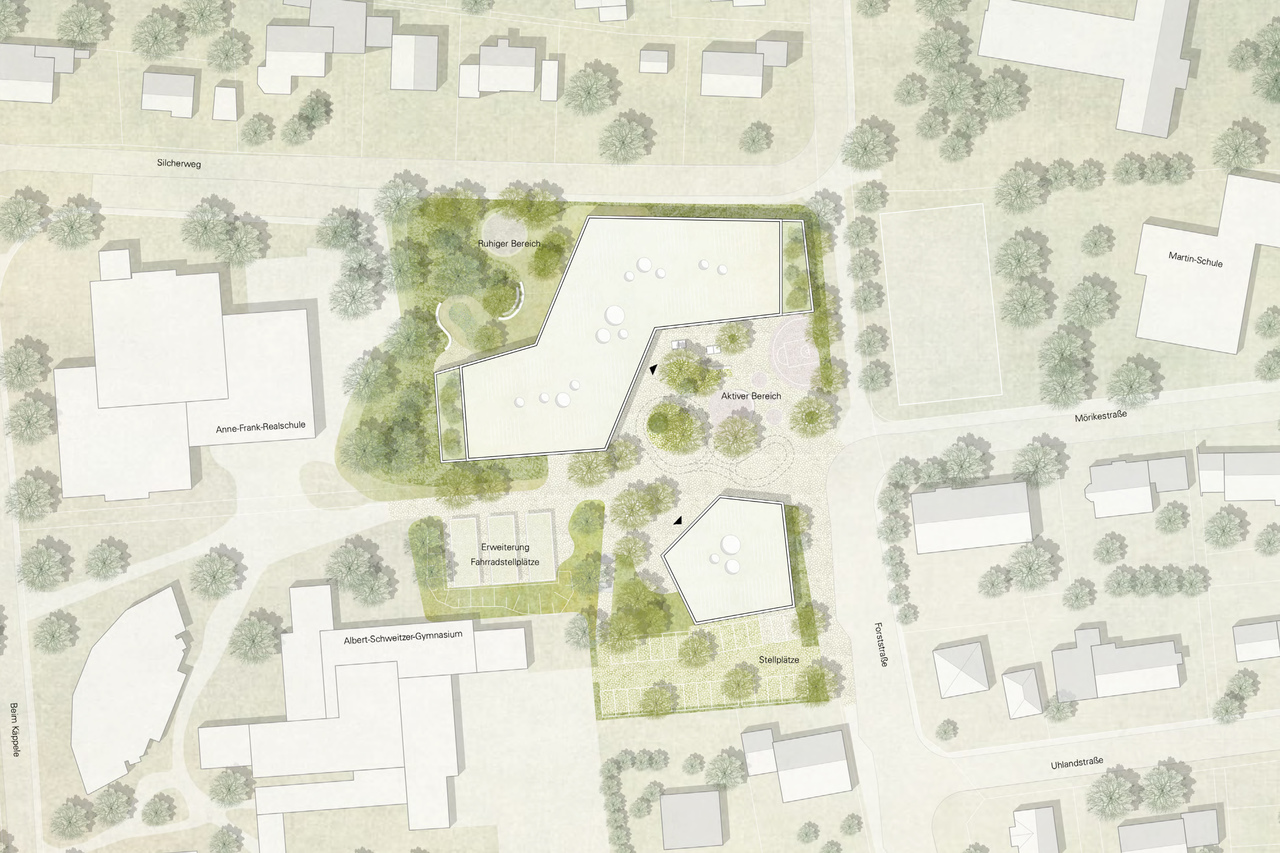 Der Neubau setzt einen markanten städtebaulichen Akzent am Eingang des Bildungscampus und fügt sich zugleich sensibel in die bestehende Topografie ein. Durch seinen mäandrierenden Baukörper entstehen differenzierte Außenräume mit hoher Aufenthaltsqualität, die das Gelände gliedern und beleben. Eine eigenständige Mensa fungiert als Treffpunkt und verbindendes Element zwischen den Schulen.