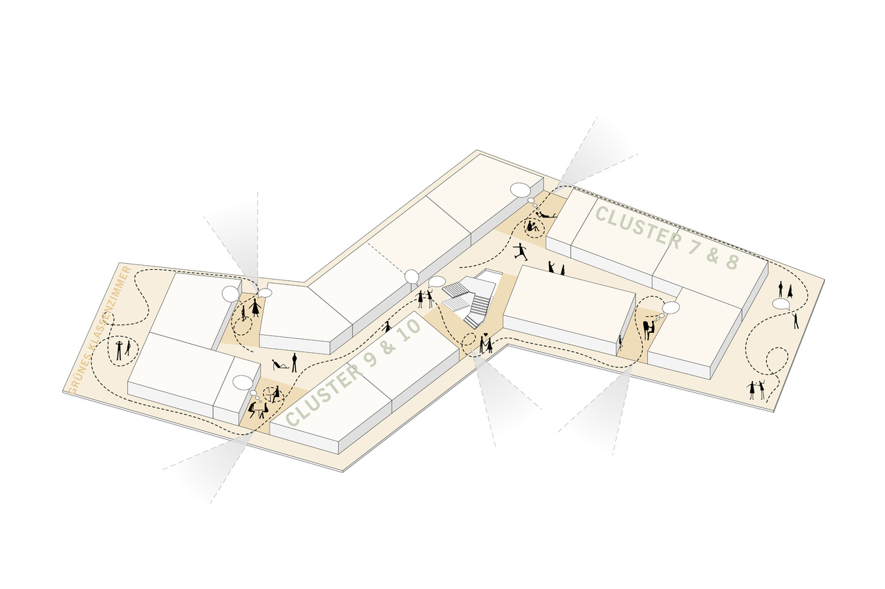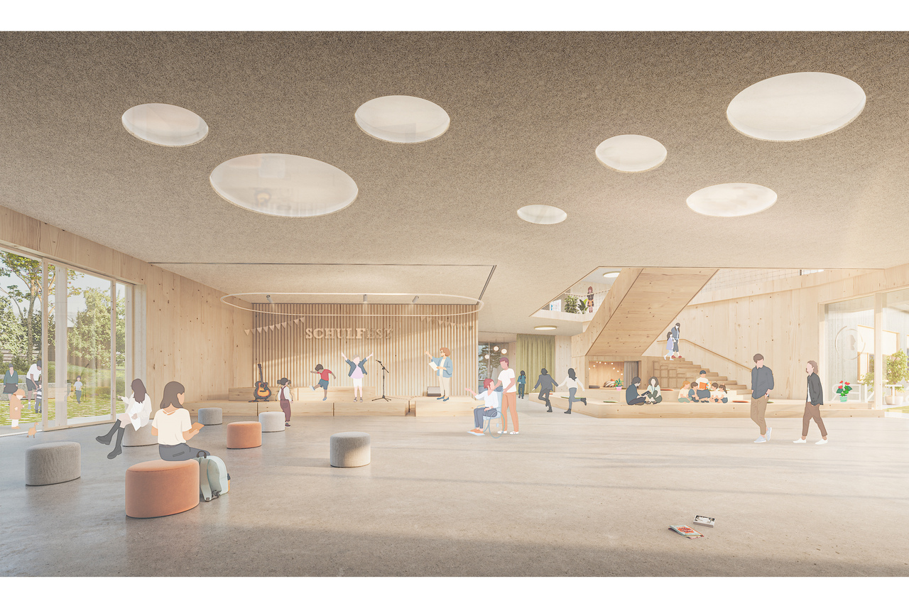 Das pädagogische Konzept wird durch die Architektur aktiv unterstützt. Transparente und offene Raumstrukturen fördern individuelle Lernprozesse ebenso wie gemeinschaftliches Arbeiten. Rückzugsorte, kreative Zonen und jahrgangsübergreifende Begegnungsräume machen die Schule zu einem „Dorf unter einem Dach“.