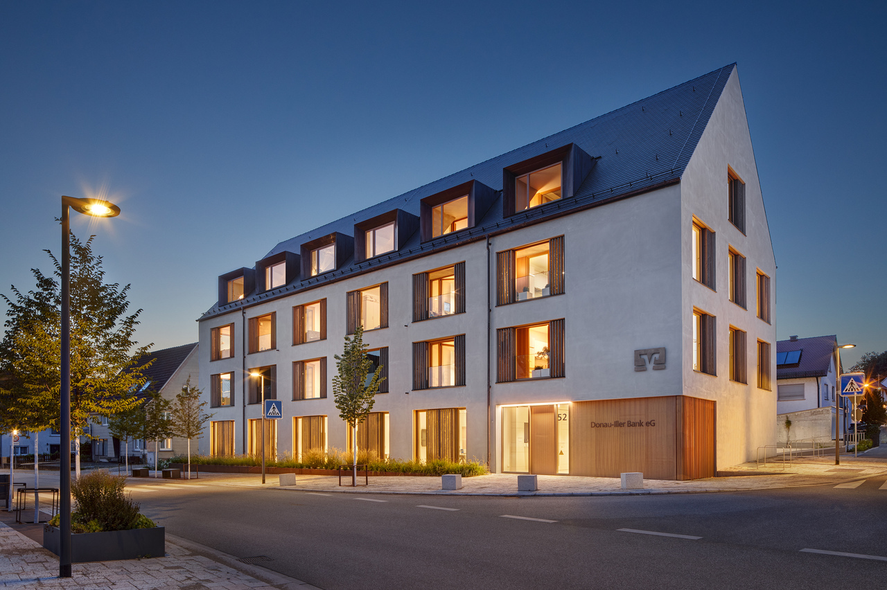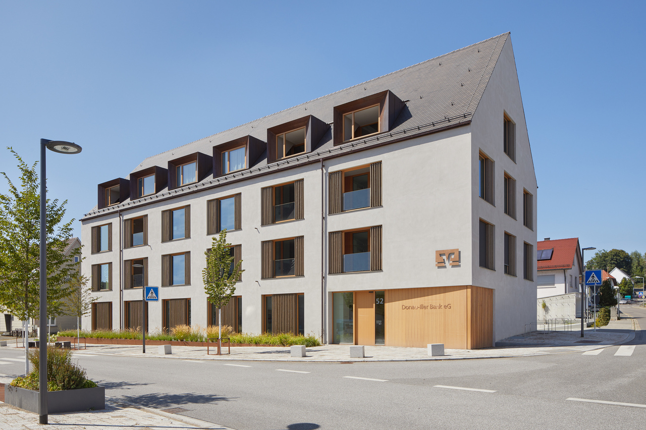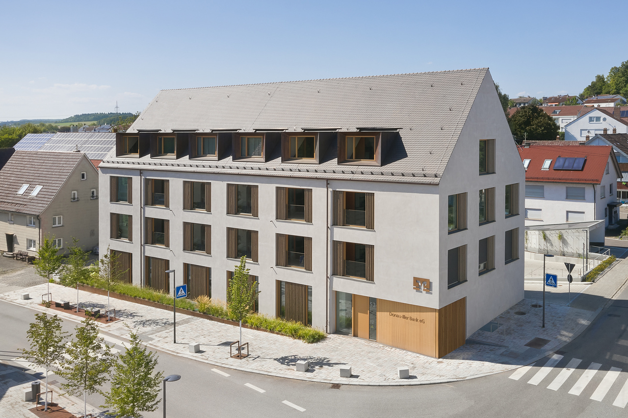 Gegenüber des historischen Rathauses in Erbach entstand ein Neubau der Donau-Iller Bank eG mit eigener Geschäftsstelle im Erdgeschoss, sowie 11 Mietwohnungen mit 2 bis 5 Zimmern in den Obergeschossen.