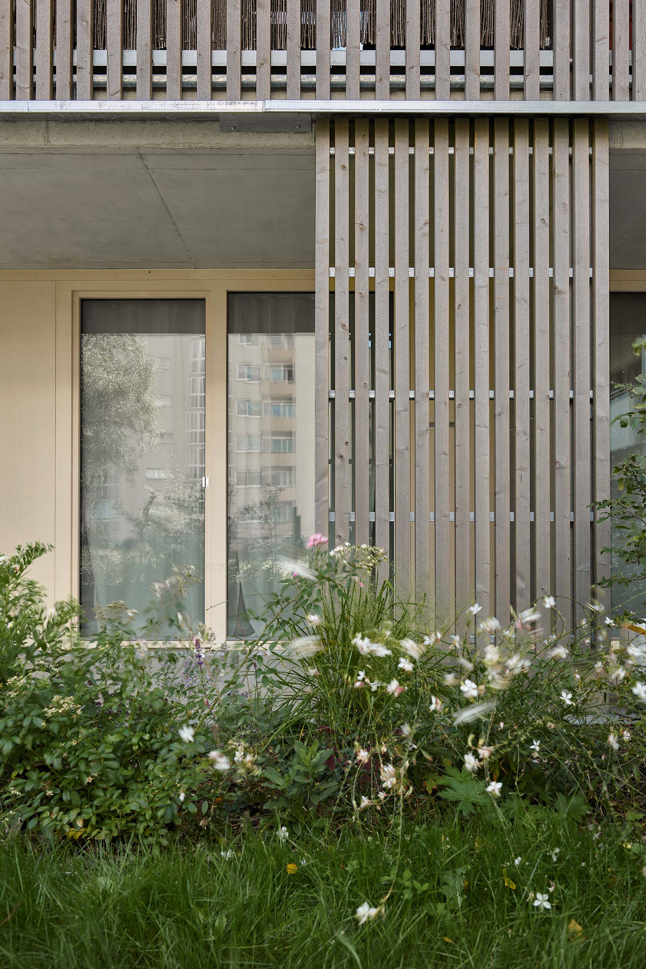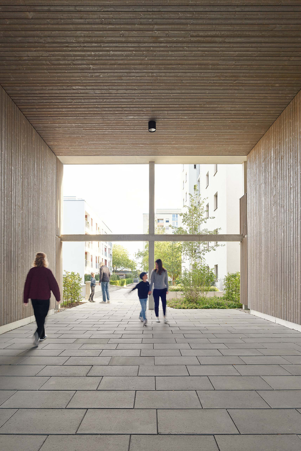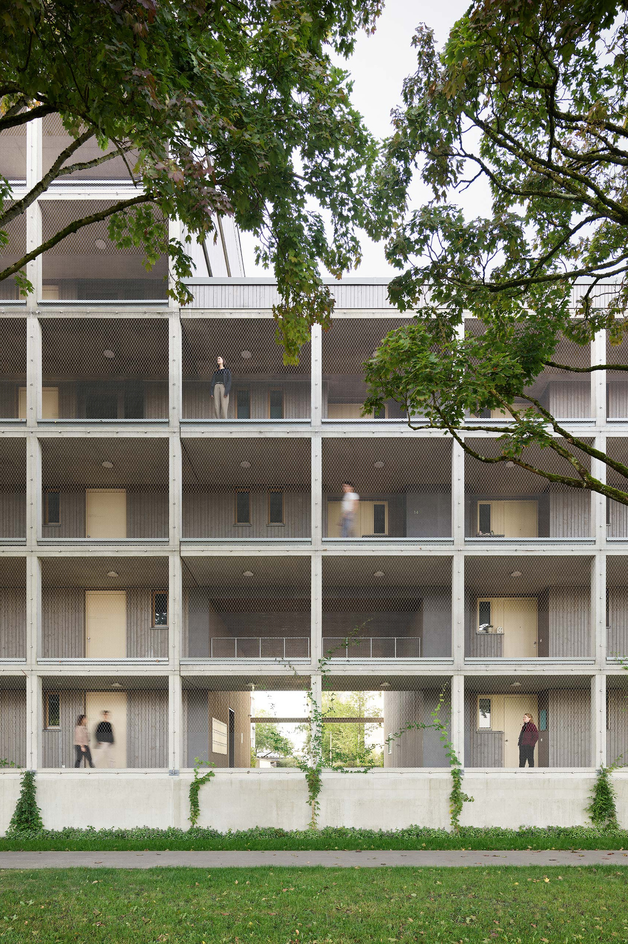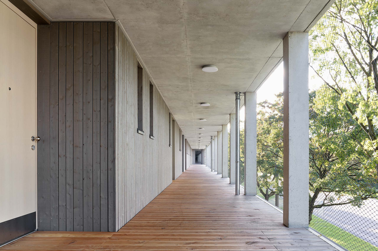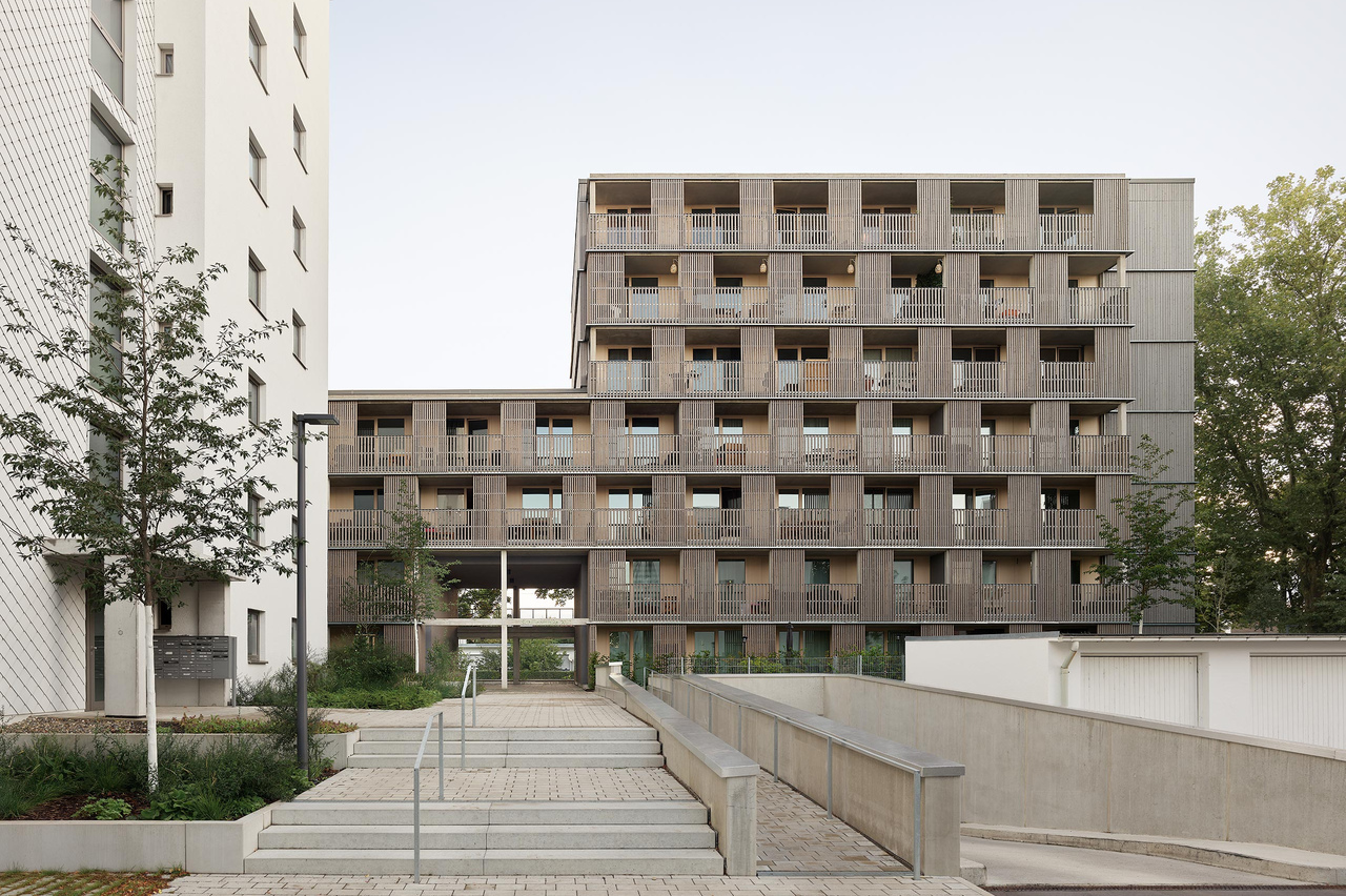 In parkähnlicher Lage zwischen Sportanlagen und Freiflächen der Wohnanlage am Ortseingang Offenhausen, ist eine Nachverdichtung des Wohnquartiers an der Schillerstraße geplant. Die alleeartige Ausbildung der Augsburgerstraße mit Ihrem hochwertigen Baumbestand, die achtgeschossige, punktartige Nachbarbebauung aus den 1960er Jahren und der schmale Zuschnitt des Baufeldes prägen die Situation. Geplant ist ein linearer Baukörper entlang der Augsburger Straße, der durch seine Differenzierung in vier bzw. sieben Geschosse einen angemessenen Übergang zur Bestandsbebauung schafft. Der PKW-Verkehr wird künftig unter die Erde verlegt. So können auf der Tiefgarage vielfältige Durchwegungen und Freiräume für die Bewohner entstehen. Der Neubau wird über einen Laubengang auf der Nordseite erschlossen. Vor den Wohnungseingängen können so kleine private Freibereiche entstehen, die Identifikation schaffen und Begegnungen ermöglichen. Der Neubau ist als Hybridbau konzipiert - mit Decken, Stützen und Treppenhäusern aus Stahlbeton, Außenwände in Holzbauweise. Auf der Südseite nimmt ein Stahlskelett die Außenbereiche der Wohnungen auf. Der Holzlamellenfilter vor der Konstruktion erfüllt gleichermaßen Absturzsicherung und Sonnenschutz. Auf der Nordseite übernimmt ein Edelstahl-Seilnetz Absturzsicherung und Rankhilfe für die flächige, siebengeschossige Fassadenbegrünung im Bereich der Laubengänge.