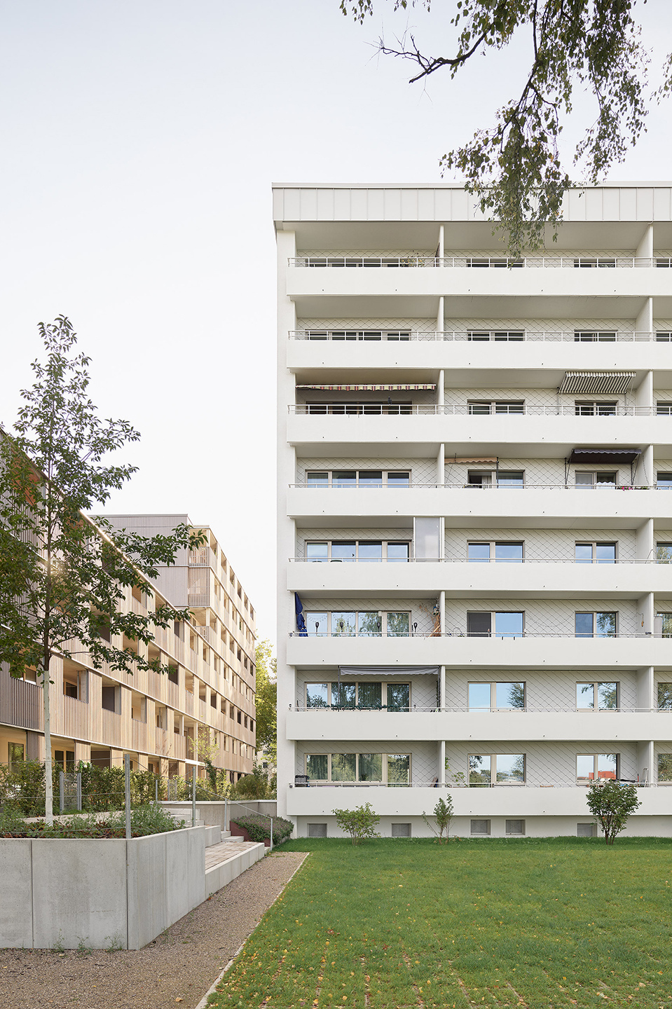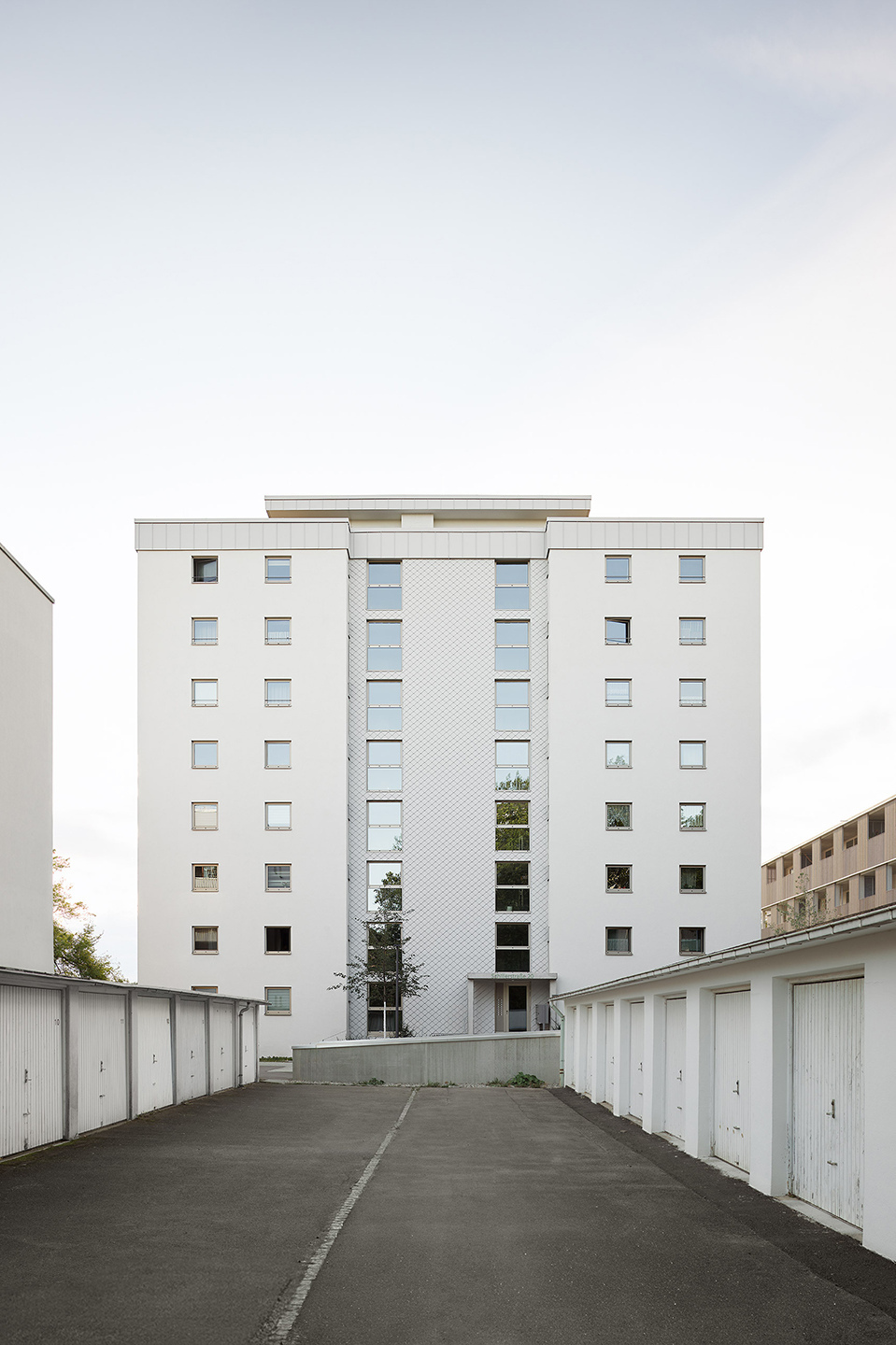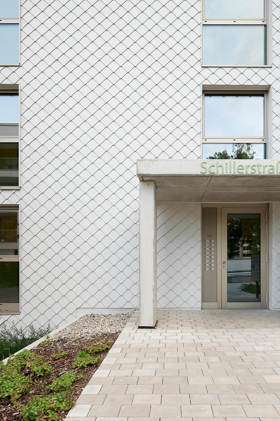 Das Bestandsgebäude der NUWOG im Wohnquartier Schillerstraße in Neu-Ulm liegt in direkter Nachbarschaft zur neu errichteten Nachverdichtung. Im Zuge einer energetischen Sanierung erhielt das Gebäude ein Wärmedämmverbundsystem mit Putz sowie Teilbereiche mit einer hinterlüfteten Fassade aus Aluminiumschindeln. Die Maßnahmen wurden im bewohnten Bestand durchgeführt, was besondere Rücksicht auf den laufenden Alltag der Bewohner erforderte. Insgesamt umfasst das Gebäude 32 Wohnungen.