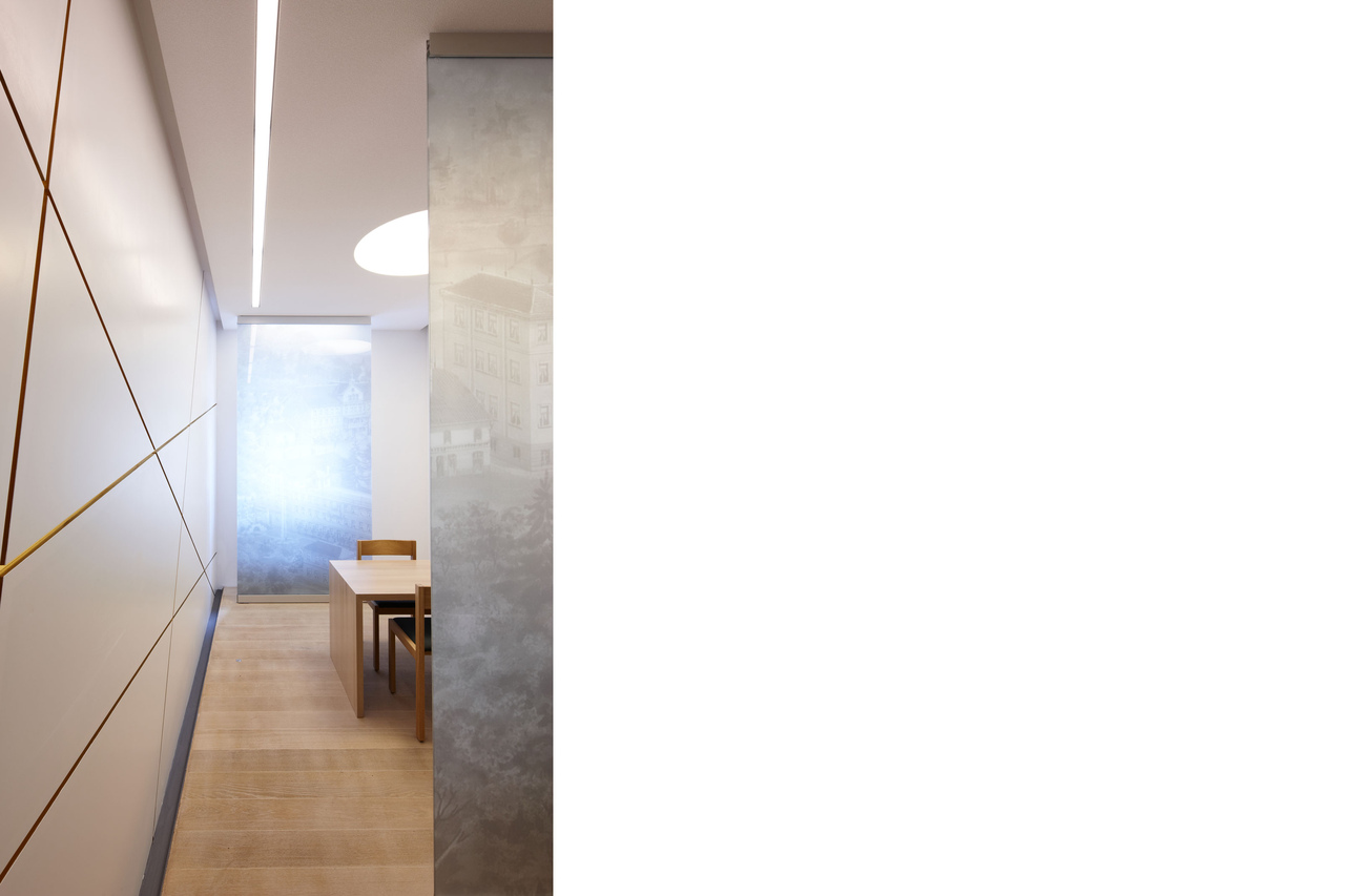 Der Grundton, welcher die Gesamtanlage nun bewegt, wurde aus der historischen Kirchen-Fassung des Künstlers „Blepp“ entwickelt, einem erdigen Farbton, welcher sich in der franziskanisch-wertigen Materialauswahl wiederspiegelt: Weiss-Eichenholz, Muschelkalk, beige Teppiche und abgestufte warme Farbtöne, die eine wohlige Atmosphäre ausstrahlen.